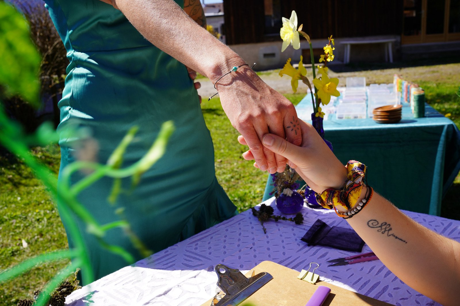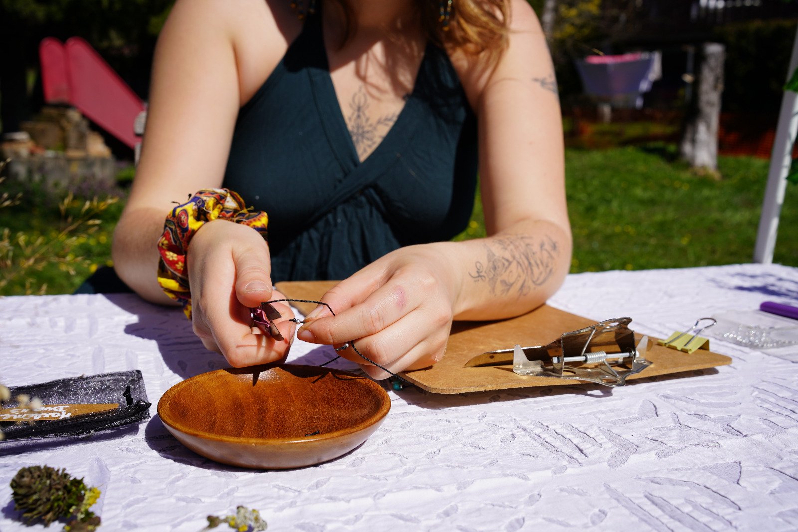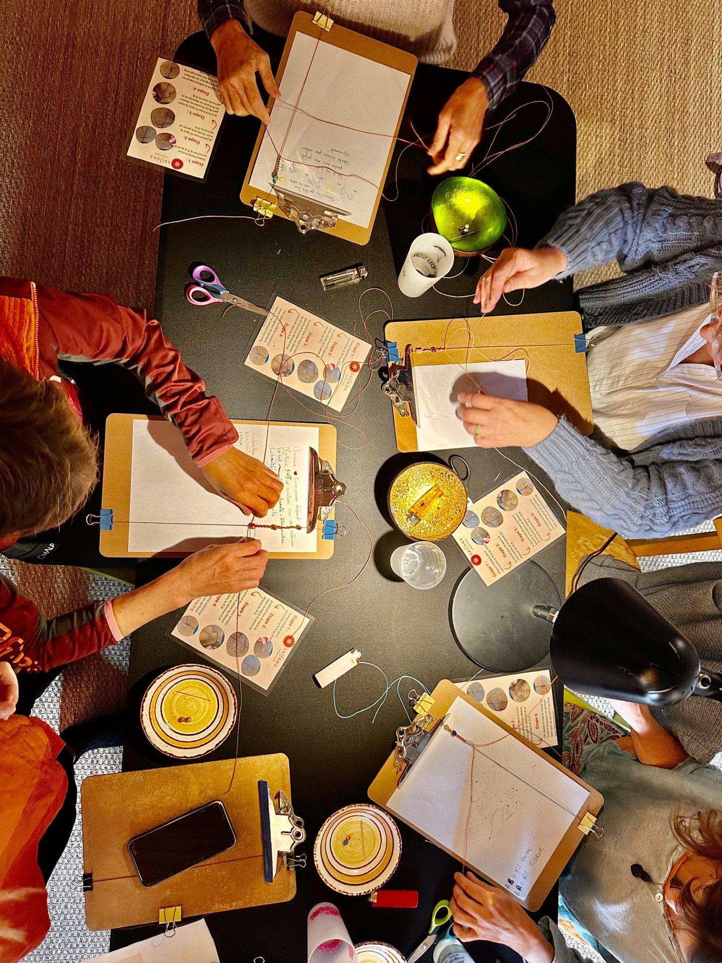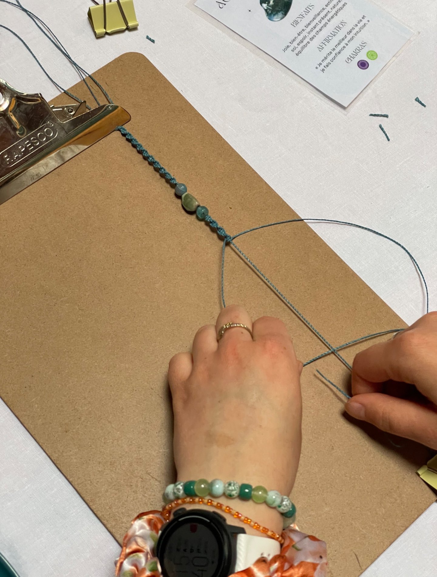 Chaque atelier commence par un petit moment d’ancrage et d’intention, puis vous tissez votre bijou pas à pas.